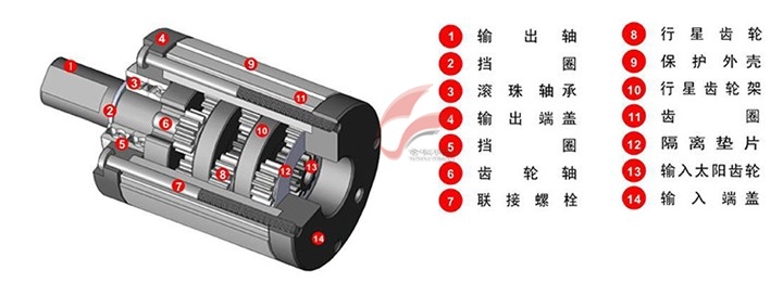 行星減速機原理:驅動源(馬達)以直接連接的方式啟動太陽齒輪,太陽齒輪將組合于行星齒輪架上的行星齒輪帶動運轉。整組行星齒輪系統沿著外齒輪環自動運行轉動,行星架連接出力軸輸出達到加速目的。更高減速比則需要由多組階段齒輪與行星齒輪倍增累計而成。