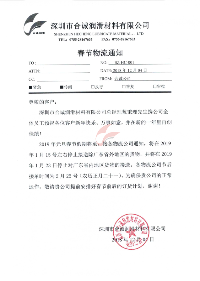 深圳合誠春節物流通知